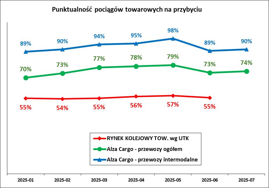 Mamy przyjemność pochwalić się punktualnością realizowanych przez Alza Cargo pociągów towarowych. Dane dotyczą roku 2025 i czasu przybycia pociągu do stacji docelowej. Alza Cargo to Solidny Partner w Biznesie. Zapraszamy do współpracy.